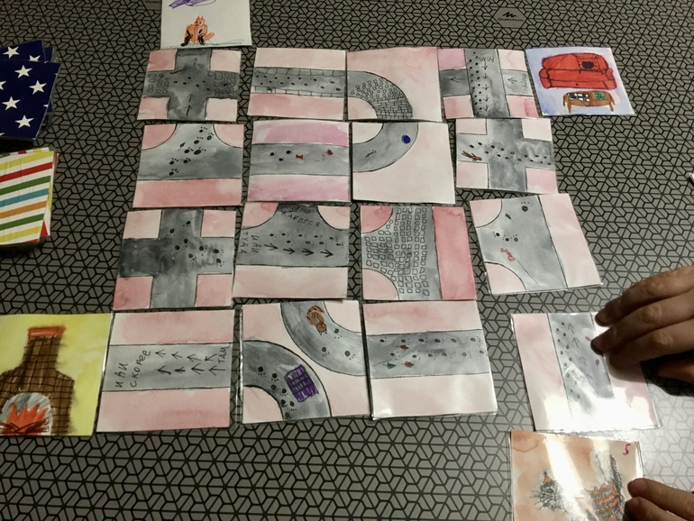 Я не ожидала, что моя идея настолько увлечет всех членов семьи. Сын впечатлился больше всех игрой, с таким трепетом он перебирал вчера карточки, рисовал, складывал, много говорил о воспоминаниях потом. Муж нахваливал наше произведение и даже с какой-то гордостью передвигал квадратики во время игры. Дочка просто радовалась, рисовала , придумывала сюжеты. А я всё это созерцала, слушала и думала, как мало нужно для счастья иной раз. Я подумала, вот будь у меня такая игра в детстве, как бы захотелось достать её сейчас, поперебирать карточки и вспомнить молодых родителей, живых , здоровых, веселых, себя маленькую, лица, склонившиеся над столом в поиске прокладывания дорожки и уют того, самого родного дома, в котором прошло детство. Может и наши дети сохранят эти смешные рисунки и когда нибудь через много лет вспомнят эти счастливые дни. Я очень рада, что мы смогли воплотить мою идею в жизнь. Играли в лабиринт, конечно, много. И вчетвером, и вдвоём, возвращались к нему в течении дня, раскладывали снова и снова.
