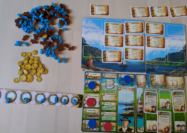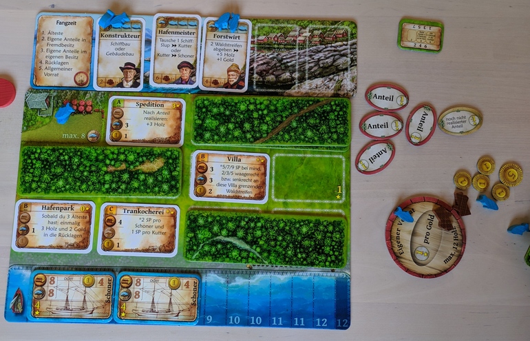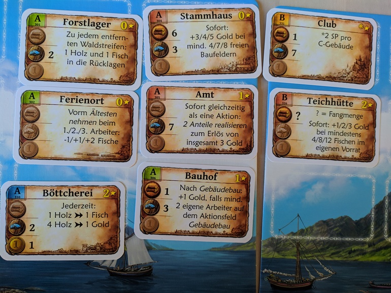Так же у игроков есть индивидуальный планшет, на котором он может вырубить леса и построить на их месте здания, расставить старейшин и накормить их рыбой, добавить в порт новые лодки. В начале тура все игроки получают рыбу (чем больше лодок купишь, тем больше рыбы)