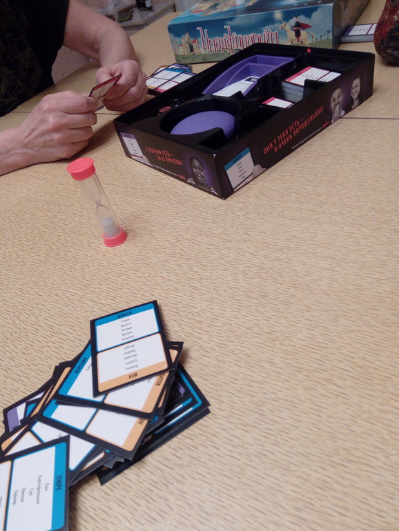 Дальше все ушли в спортзал, остались только я, моя мама и её подруга. Мы решили поиграть в Табу, втроём. Правил нам никто уже не объяснял, но мы играли по своим. Пищалкой пользоваться нельзя, чадо спит. Поэтому мы просто переворачивали часы и объясняли слова с карточки друг-другу, кто сколько успеет, тот столько карточек себе и забирает. Ну здорово позагадывали-поотгадывали. Все! карточки использовали, прям вот сидели и объясняли, объясняли, ойкали, меняли слова, хихикали. Нам всем было хорошо.