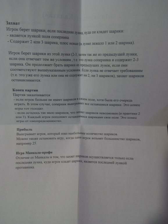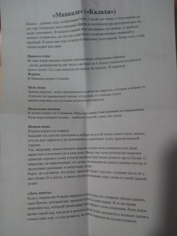 Имеется 6 ячеек в ряд для каждого игрока и амбар (манкала или калах) справа. В каждую ячейку кладется по 4 (для дорожной версии) или по 6 (для стационарной) камешков. Первоочередность хода определяется жребием. Игрок берет все камешки из одной из своих ячеек и раскладывает, начиная со следующей ячейки по одному камешку против часовой стрелки, включая свой амбар, но исключая амбар противника. Если последний камешек оказывается в своем амбаре, то появляется делается еще один ход. Если последний камешек оказывается в пустой ячейке на своей стороне, а в ячейке напротив есть камешки, то камешки с обеих ячеек помещаются в свой амбар (происходит захват). Ну, и когда в своем ряду заканчиваются камни, то заканчивается и игра. Камни противника помещаются в его амбар. Кто больше набрал камней, тот и победил. Вроде игра доступна для понимания детям от 6 лет.