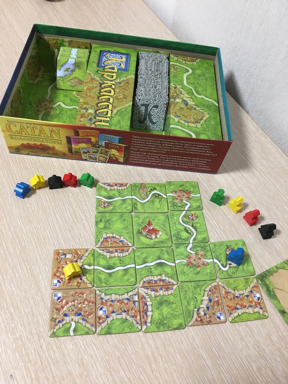В выходные зайдя в детский мир я совершенно случайно увидела на полочке заветную коробочку с игрой Каркассон. И тут я устоять никак не смогла. В итоге вечером разложили пару партий игры. Играли пока без дополнений. Не могу сравнивать дизайн с предыдущей версией, т.к. не видела "вживую". Но этот дизайн мне очень понравился. Перед игрой сидела рассматривала рисунки на тайлах.