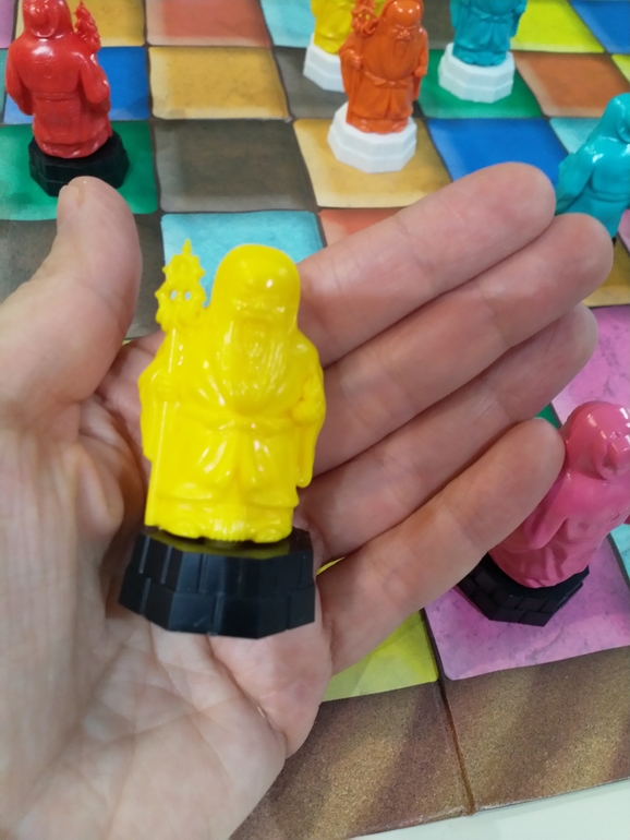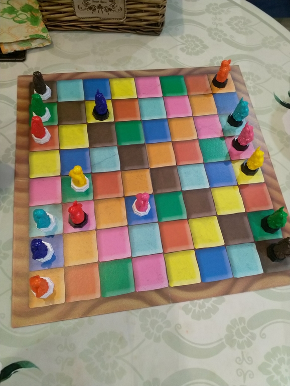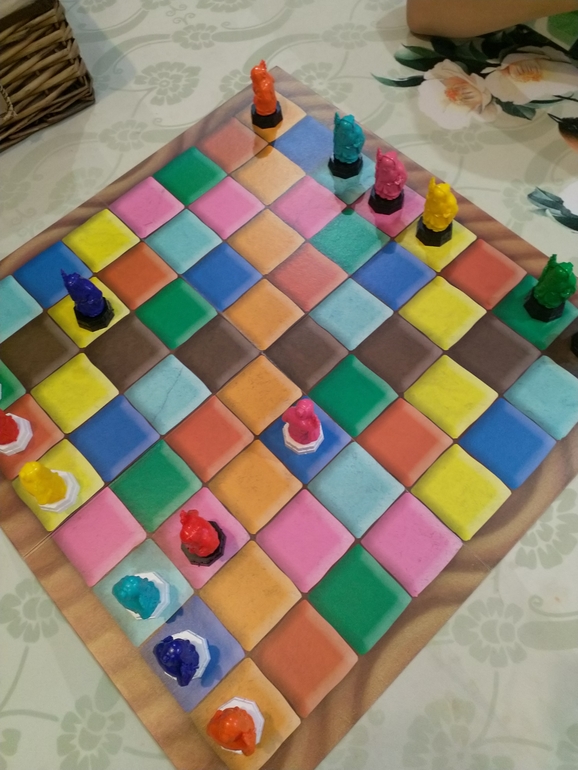 Если кто не знаком с игрой, расскажу правила. Выставляем монахов всех имеющихся цветов с белым и черным основанием (так мы их будем различать) на свой цвет по бокам поля. Первый игрок ходит любым монахом на любую клетку, но ходим только прямо или по диагонали, только вперёд!!! В бок и назад ходить нельзя. Второй игрок ходит монахом того цвета, на какой клетке остановился его соперник, всё, по этому правилу и продолжаем делать ходы. Выиграет тот, чей монах, любой, первым доберется до противоположной стороны поля. Но это только русская версия, Ксения в сообществе рассказала, что есть и более сложные правила, надо поискать в сети, там с поясами для монахов, но пока не могу сказать, не изучала.