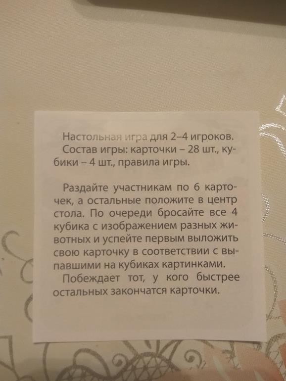 Тем не менее детям эта игра понравилась.Дочке 6 ,играет с удовольствием.С младшим сыном,3 года, играем просто,не на скорость.Кидаем кубики и ищем подходящую карту.