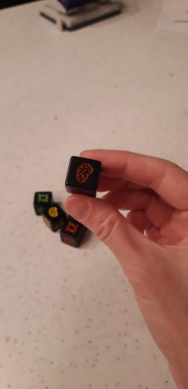 Состав - пластиковый стаканчик и 13 кубиков - 6 зеленых, 4 желтых, 3 красных. На каждом кубики изображены значения - мозг, выстрел, следы ног. Кубики приятные, сделаны качественно.