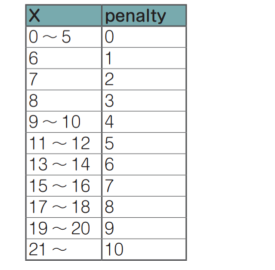 При подсчёте очков в плюс идут баллы за законченные линии метро и за квадраты, где вместо кружочков стоят цифры, а в минус идут баллы за штраф, который даётся за каждый оставшийся незаполненным квадрат согласно этой таблице (х обозначает количество пустых квадратов, penalty - штраф):