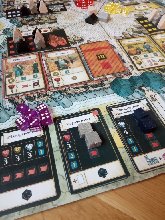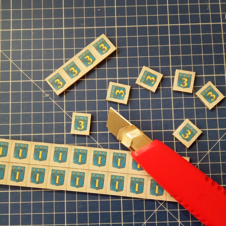Кубики взяла из Саграды, маркеры сделала из просроченной полимерной глины,слепить из нее уже ничего не получилось бы,сильно подсохла,однако нарезать на кубики получилось, и по 20 кубиков маркеров готово. Я сделала два набора + нейтральный игрок,пока нам больше не нужно.
