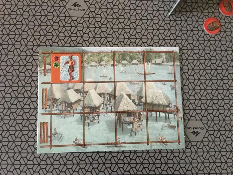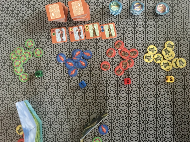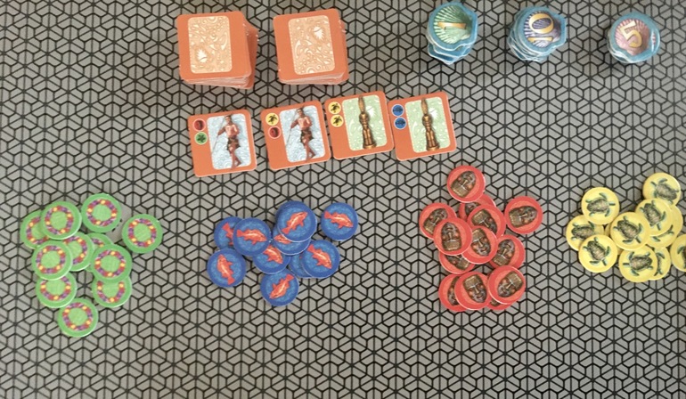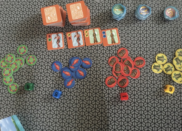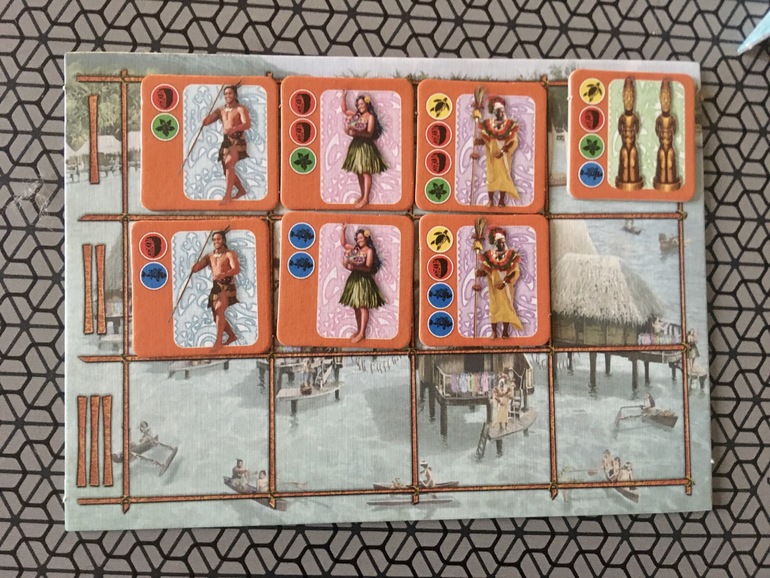На рынке есть четыре вида товаров: венки, рыбы, маски и черепахи. Также есть стопка с тайлами покупателей ( мужчины, женщины и жрецы) и тотемы.