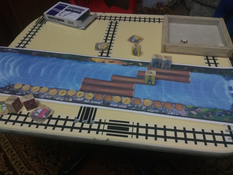 Бросив кубики, получаешь 2 результата - количество клеток, на которые спускаются бревна и количество ходов для своего перса. Самая тактика тут, кмк, это перепрыгивать через других игроков (в т.ч.), тратя меньше своих ходов и переставлять бревна, мешая соперникам. Но надо учитывать, что бревна вверх по реке не плывут, так что надо быть готовым к тому, что некоторые монеты так и останутся на берегу.