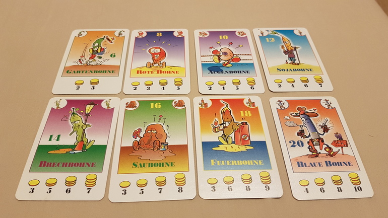 Интересно, что сбор урожая и продажу бобов игрок может производить в любой момент игры, в том числе и не в свой ход. Внизу карт указано сколько монет можно получить при продаже определенного вида бобов, число под монеткой указывает, сколько для этого нужно собрать карт. Обратная сторона карт (рубашка) и есть сами монеты, остальные карты при продаже идут в сброс.