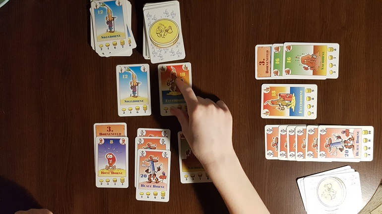 Каждому игроку раздаётся по 5 карт, и важный момент - что как раздали, так в таком порядке их и держишь в руке, и выкладываешь по очереди. И когда игрок добирает карты, то он берёт по одной и добавляет позади последней карты в руке.