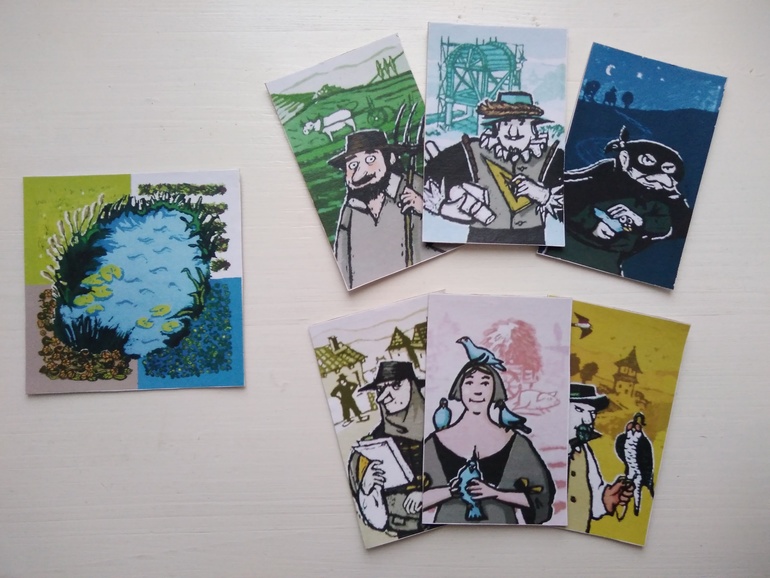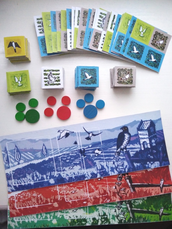 В состав игры входят 4 индивидуальных планшета (мы обычно играем втроём - поэтому я сделала три), 34 карты, 60 тайлов голубей, 12 тайлов ястребов и 16 голубятен (4 из них большие).