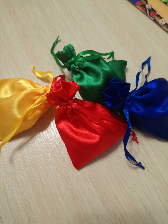 В мешочках хранятся колышки, в нашем случае фишки - очень удобно, ведь каждый игрок ходит своим цветом, как в случае с Четыре в ряд или шашки, и при хранении в индивидуальных мешочках они не перемешиваются между собой.