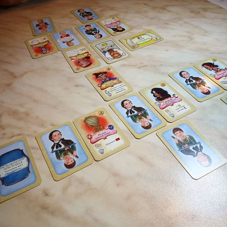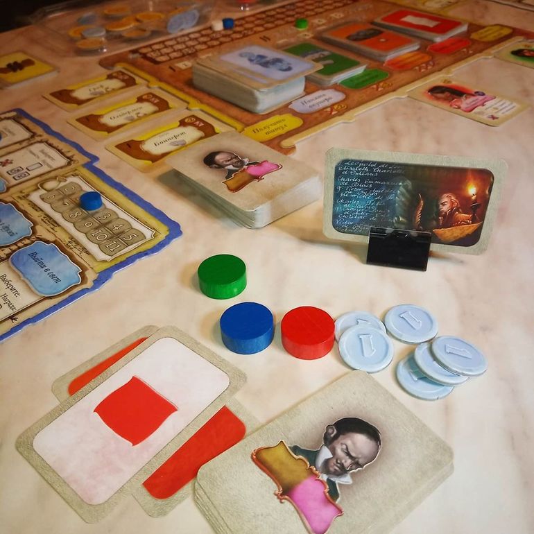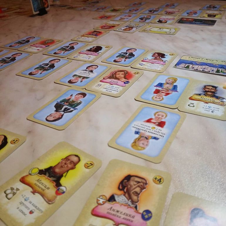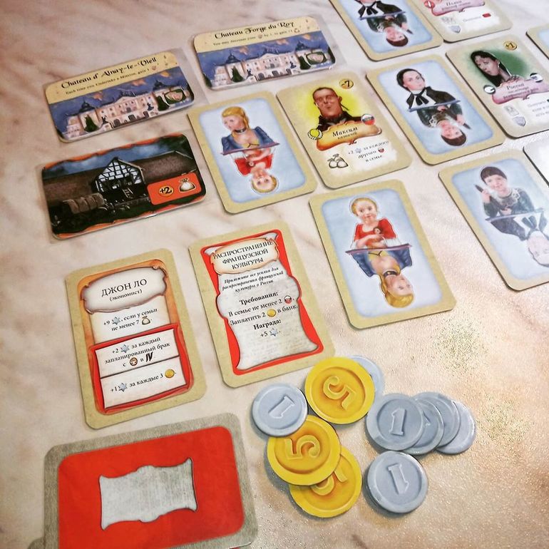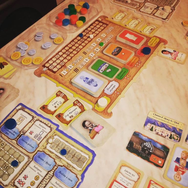 Однообразные карты Поместий и Предприятий мы заменили на соответствующие дополнения: Legacy: Extra Mansion Cards и фанатское от ReqMan с BGG. Теперь зелёная и оранжевые фишки приносят больше бонусов и возможностей, чем не преминул воспользоваться дружественный нам, но всё же конкурирующий род.