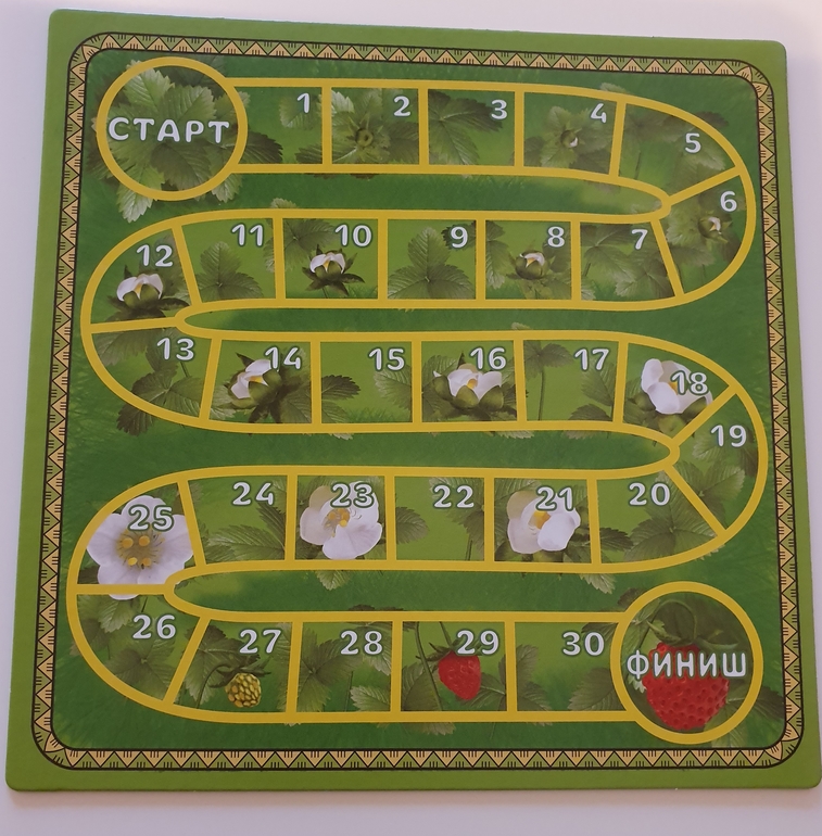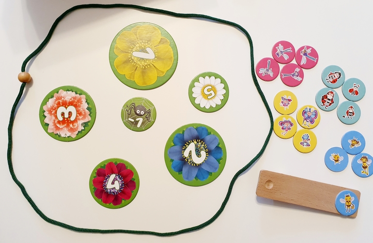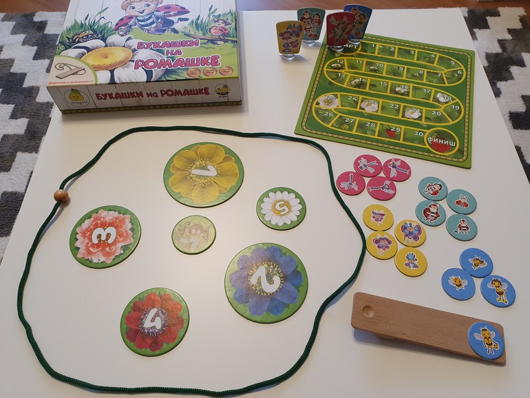 Итак. Нужно организовать полянку, создав окружность шнурком с деревянной бусиной. На полянке размещаются цветы, попадая на который, букашка зарабатывает очки, количество которых равно количеству шагов на поле.
