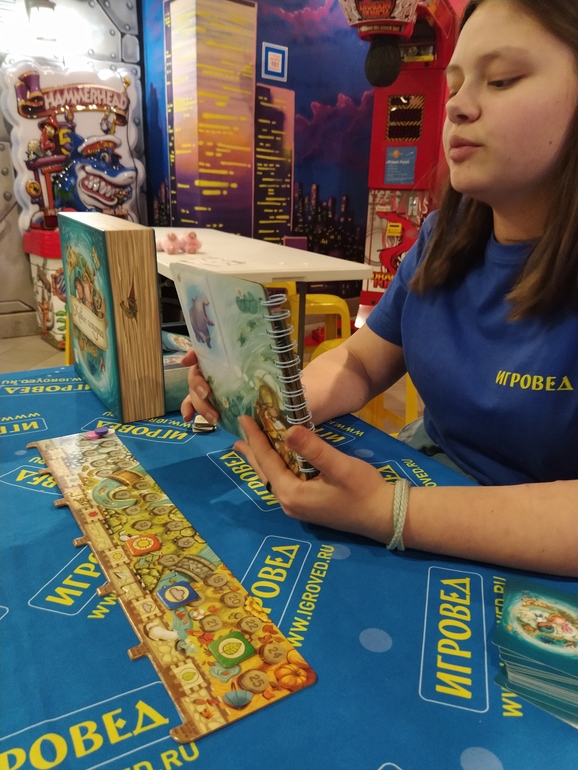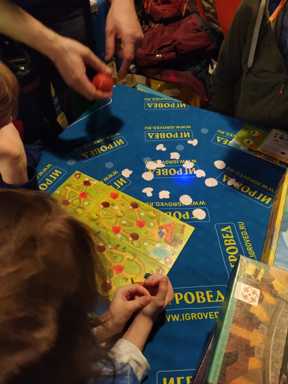 Пытались поиграть в Жадюги. Сами с правилами мы как-то плохо разобрались, а два из пойманных нами представителя Игроведа их не знали, поэтому поиграли как могли, но по-моему что-то опустив. Т.к. потом Марусинка нашла знающего представителя и правила им объяснили более четко. Ребенок к этой игре остался равнодушен, хотя играть в нее можно и с 5 -6 лет, но компоненты ребенка не впечатлили. Играть повторно отказался.