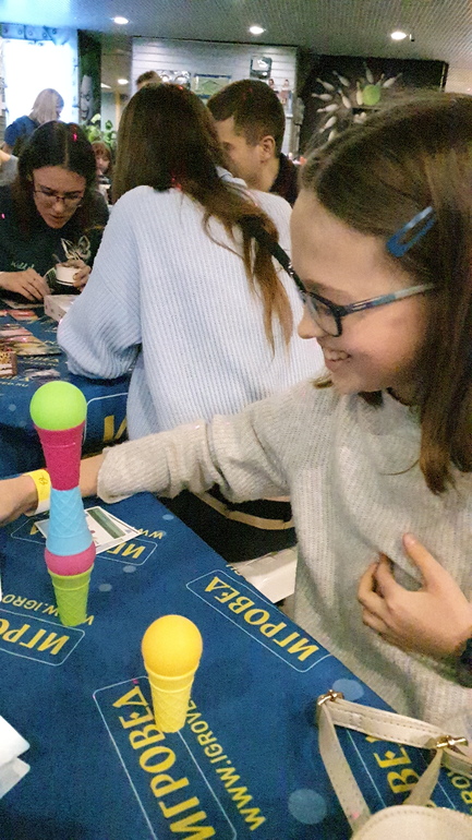 Мороженое - тактильный восторг от шариков и вовлеченность в процесс 100%. Вот что может быть проще? Ну разве что столы если бы были устойчивые. А тут одна стол ногой пошатнёт, все валится, надо ловить шарики, а руками трогать нельзя. Забавно, некое усложнение от Игроведа для тех, кто по факту игру перерос :) Дочь попросила подарить брату такую игру, но я лучше подарю племяннику, когда он чуть подрастет, чтобы мои могли побаловаться у родственников :)