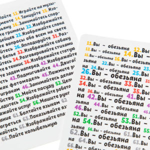 Фотографий нет,они из интернета,это бланки с заданиями. Тут уже писали правила. Вкратце, все получают задания которые нужно потом одновременно показывать, но кому то выпадет карточка "Вы обезьяна", и ему нужно понять что показывают и показывать так чтобникто не догадался что обезьяна - это он. Тут может быть куча жутко смешных ситуаций.