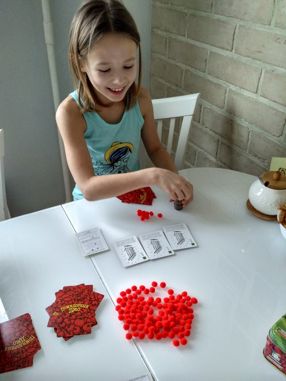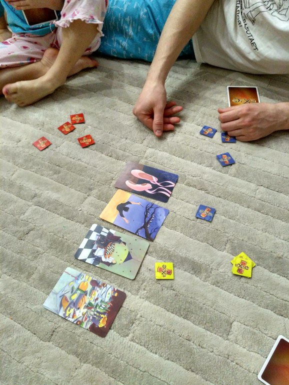 Насыщенная конкуренцией, пакостями соперникам и неожиданными поворотами. Игра понравилась, но первые две партии игрались очень медленно, так как читали карты. У каждой свое значение и свойства, третья партия игралась легче, думаю потом будет весело. Вчера играли с папой, тяжеловато ему было, мы карты уже примерно знаем а ему приходилось читать все. Но муж любит такой тип игр!! Думаю и Даша оценит, когда немного подрастет.