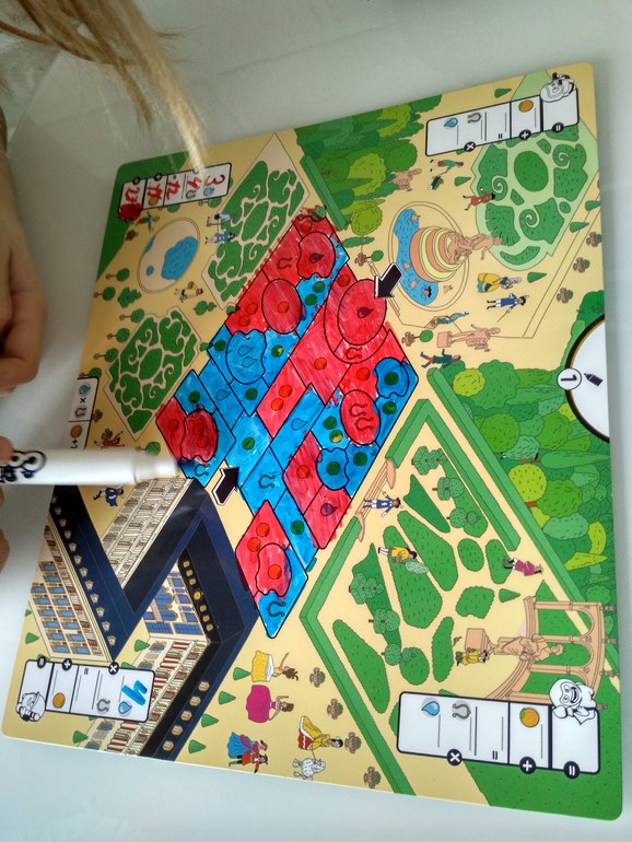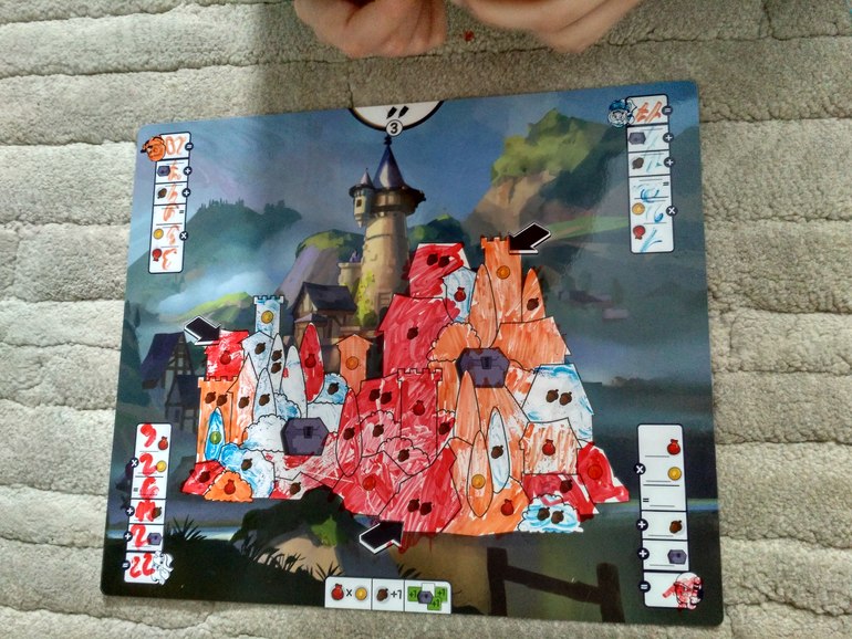 Аня закрасила 3 фонтана и 4 лиры, эти значения перемножаются и 11 апельсин итого 23 очка!! Очень удобный подсчет, как для записи так и для понимая за что в этой партии даются очки.