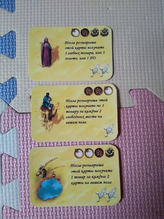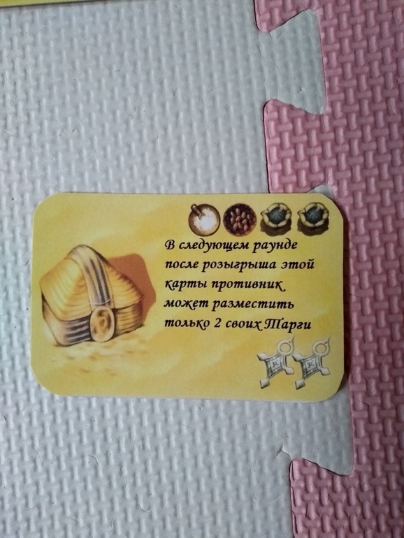 Карты племени это главный способ получить победные очки. Всего их 5 типов, легко отличаются по картинкам - Оазисы, Колодцы, Шатры, Наездники и Тарги. Вы оплачиваете цену карты товарами, забираете ее себе и размещаете перед собой. После розыгрыша карты вы получаете ПО, нарисованные на ней (медальоны в правом нижнем углу) и применяете ее эффекты - сразу, каждый раунд или в конце игры.