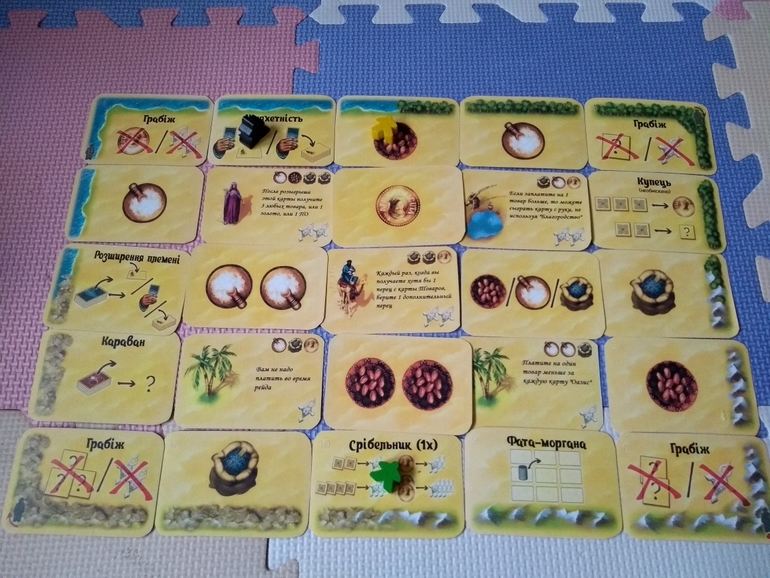 Маркеры племени ставят на пересечения линий от одного до другого своего мипла. Те карты, которые оказались под маркерами племени, можно разыграть - либо получить с них товары, которые на них нарисованы, либо забрать себе карту племени, заплатив ее цену в товарах или золотом. На фото ниже желтый игрок получит 2 финика с карты и карту оазиса, если заплатит ее цену. Плюс то, что нарисовано на картах границ, на которых стоят его человечки (финик, перец и откроет верхнюю карту стопки товаров и заберет, что на ней нарисовано). Зеленый игрок соответственно - карту оазиса, один товар на выбор с карты и плюшки карт границ - соль, откроет карту колоды племени и может забрать ее себе и особый вид читерства на Фата-Моргана)