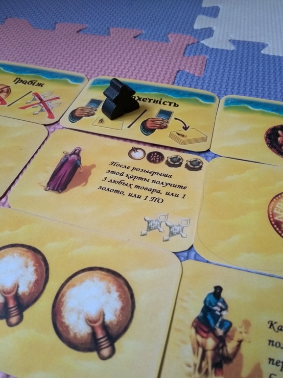 Написано сложно? Поверьте, механика осваивается быстро. Кажется, что очень просто? Вы просто не играли с опытными игроками, которые заканчивают игру за 9 раундов)) В Targi можно играть по-разному. С мамой мы собираем карты, не мешая друг другу. С мужем же играем в полную силу) Я заприметила карту? Муж блокирует, а потом и вообще сбрасывает ее из игры. Я вижу, что муж собрался сыграть карту с руки, но у него не хватает золота на ее оплату? Заблокирую ему Купца на границе, чтобы он не обменял там свои товары на золото. Есть над чем подумать. На партию у нас уходит примерно час со всеми раскладками и собиранием обратно.