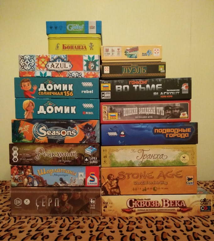 Надо же, почти всё, как у меня. Джайпур держу только потому, что сын просил не продавать, у меня с первой партии вопрос, из-зачего столько шума. 7 чудес, Каменный век мимо. Пэчворк хорош, но быстро изжил себя. Остальные даже не рассматривала, точно не моё. Орлеан простой, как двери, с одной стратегией. В чём люди видят прелесть, для меня загадка.