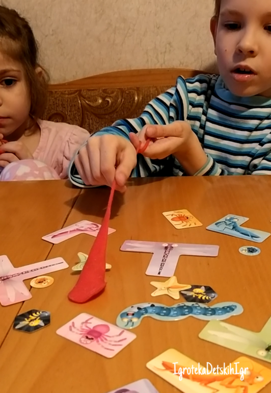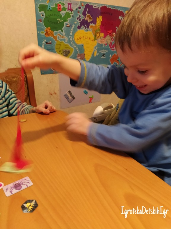Кидаем кубики, определяем тип и цвет насекомого и ловим его всем скопом. Кто поймал, тот и получил жетон хамелеона. Кто набрал 5 хамелеончиков, тот и выигрывает. Если же игрок зацепит нечаянно и осу, то жетончик он не получит.