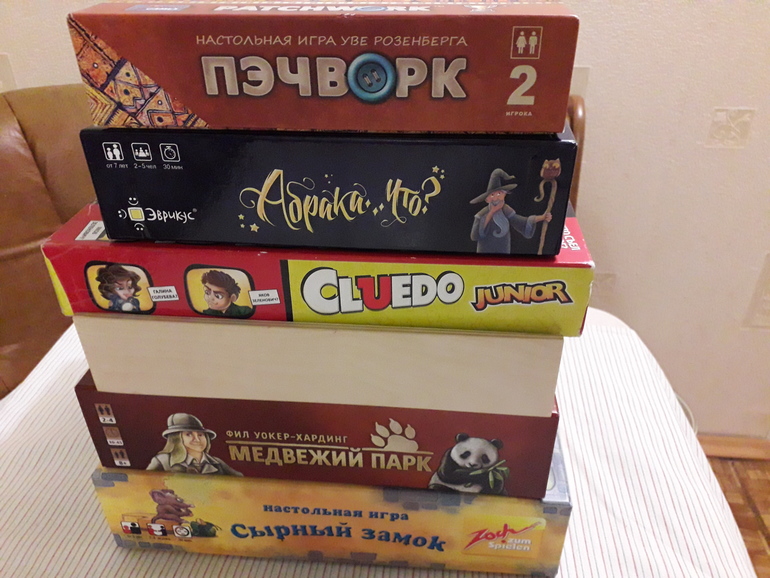 Игровые дневникиПредложила сыну: "Давай во что-нибудь поиграем? Я в "Пэчворк" хочу и ты можешь что-нибудь выбрать". Кричит: "Я выбрал. Только помоги донести". На сегодня наша стопка выглядит вот так: