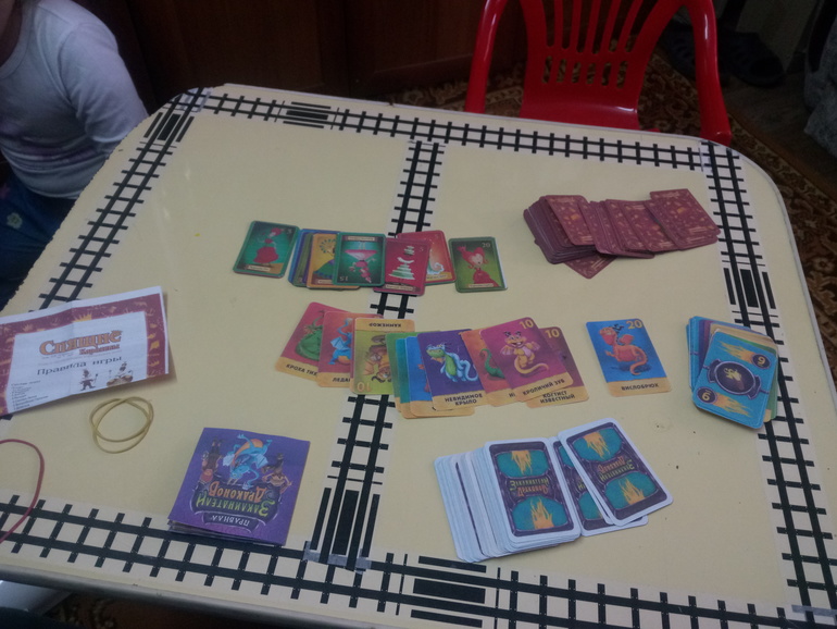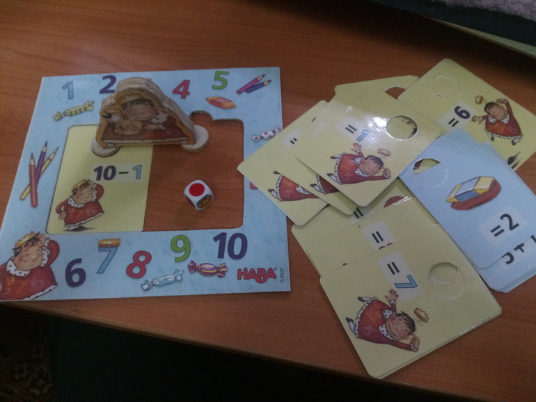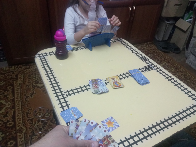 Как все, наверное, знают - это игра от Лас-Играс точная копия Спящих королев. Сейчас сыграли и обнаружил неприятный момент - карты совершенно невозможно держать в руке веером. Если числа можно еще вывернуть налево, то карты с рисунками просто не видны - их надо располагать друг над другом. И непонятное правило для камнежора еще. В остальном игра понравилась оформлением больше Королев. И еще выявился один момент - дочь совершенно раздружилась с цифрами и сложением, хотя еще год назад, наверное, у нее и то лучше получалось. Потому достали Спящих королев и тут я окончательно в этом убедился. Что ж, достали еще пару старых игр