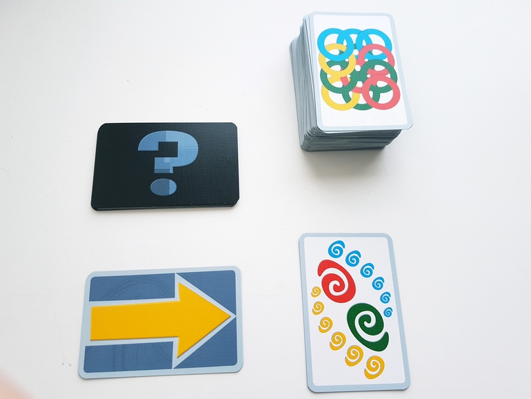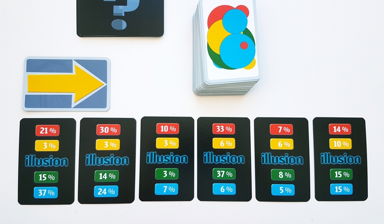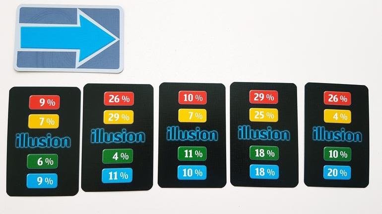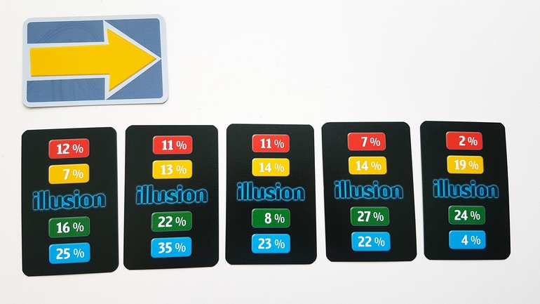 Перед началом раунда мы открываем одну случайную стрелку и кладем рядом верхнюю карту из колоды картинок. Остальные стрелки лежат лицом вниз, а карты с цветными элементами наоборот - лицом вверх. Это важно, никто раньше времени не должен видеть указанное в процентах количество цвета на карте.