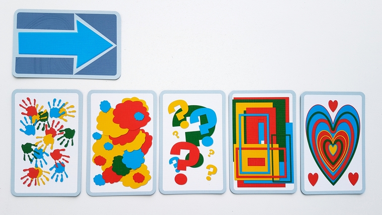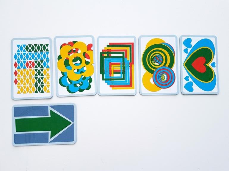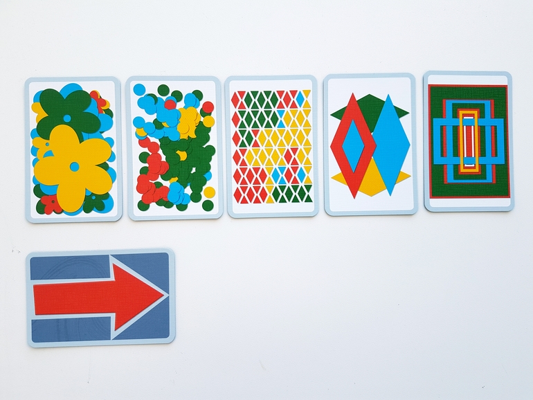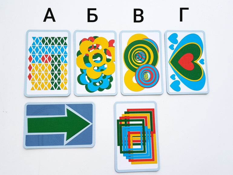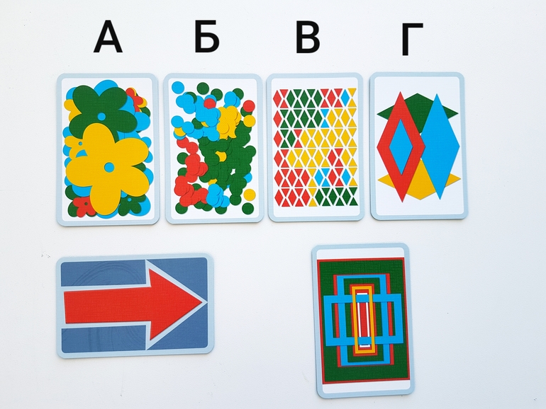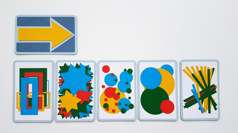 Затем первый игрок берет карту из колоды картинок и размещает ее слева или справа от начальной так, чтобы начиная от стрелки каждая следующая карта содержала больший процент определенного цвета (на моих фото желтого), чем предыдущая.