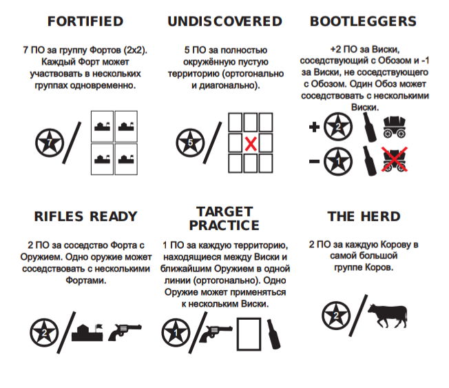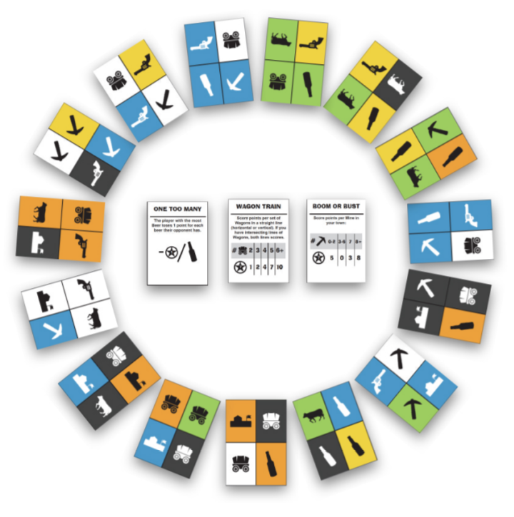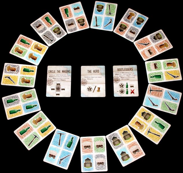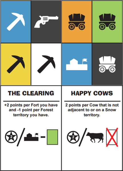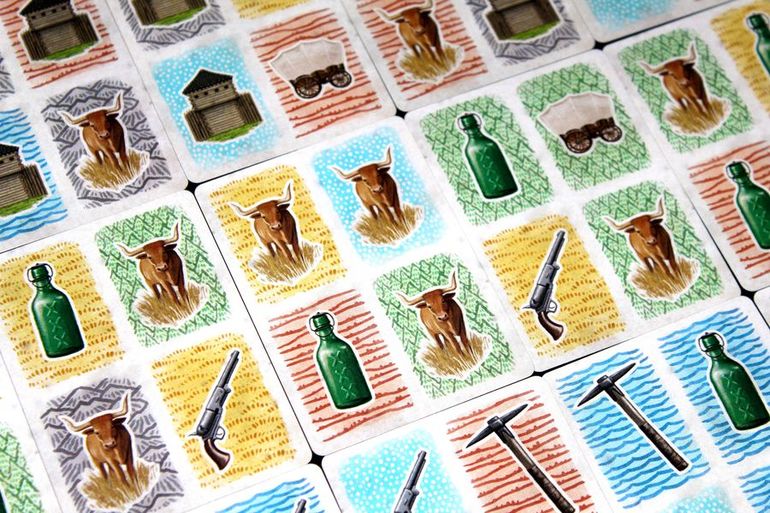 В игре всего 18 карт. На одной стороне - 4 квадрата с территориями и символами, на другой - условия получения дополнительных очков. Всего 6 типов территорий: лес (зелёный цвет), вода (голубой), горы (чёрный), снег (белый), пустыня (оранжевый) и равнина (жёлтый) и 6 типов символов: форт, обоз, оружие, пиво, шахта и корова.