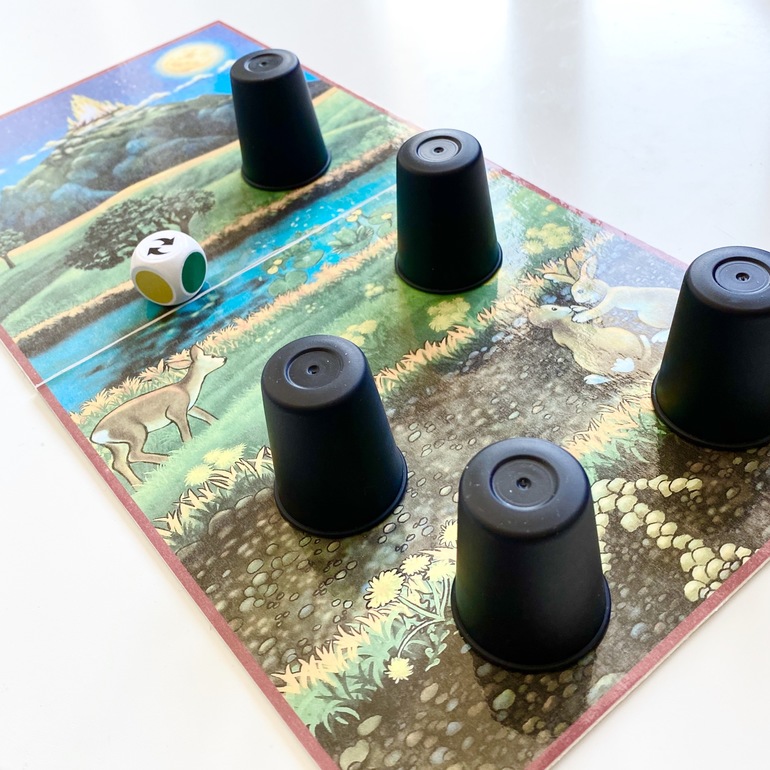 Суть игры такова (если вдруг кто-то еще не знает ☺️): прячем все фишки под шляпками, по очереди бросаем кубик и угадываем/вспоминаем под какой шляпкой ведьмочка, выпавшего на кубике цвета. Угадали - передвигаем эту фишку и шляпку вперед, нет- ход переходит к другому. И так далее, пока кто-нибудь не приведет какую-нибудь ведьмочку к финишу. Если выпали стрелочки: меняем местами любые две шляпы. ⠀