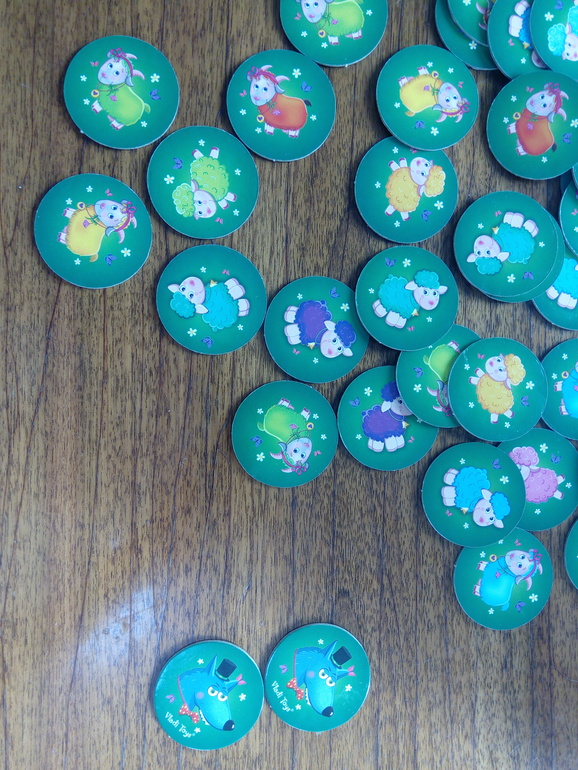 Внутри 96 круглых жетонов диаметром 5 см. Картон очень плотный, картинки такие милые-разноцветные овечки, но попадаются и козочки. Цвета очень сочные, яркие, у меня на фотографии плохо видно.