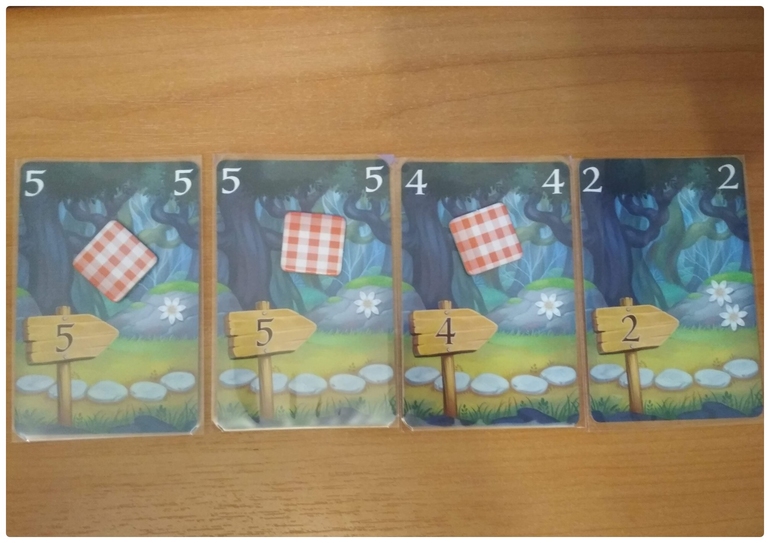 Вот небольшой пример. Первая карта была №5 с одним цветком. Взяли вторую тоже с №5, перед ней всего одна карта, т.е. 5>1, снова кладем на карту тропинки один жетончик находок.