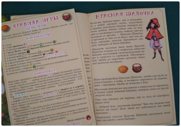 Кроме прочего, за Красную Шапочку еще два помощника, это горшочек с маслом и пирог. Их можно съесть, продвинуться на 1 ход за каждый ингредиент, но прийти к бабушке с пустыми руками. Зато успеть раньше Волка, ведь тогда игра автоматически заканчивается победой игроков. Но если Волк добрался раньше до домика - все проиграли.