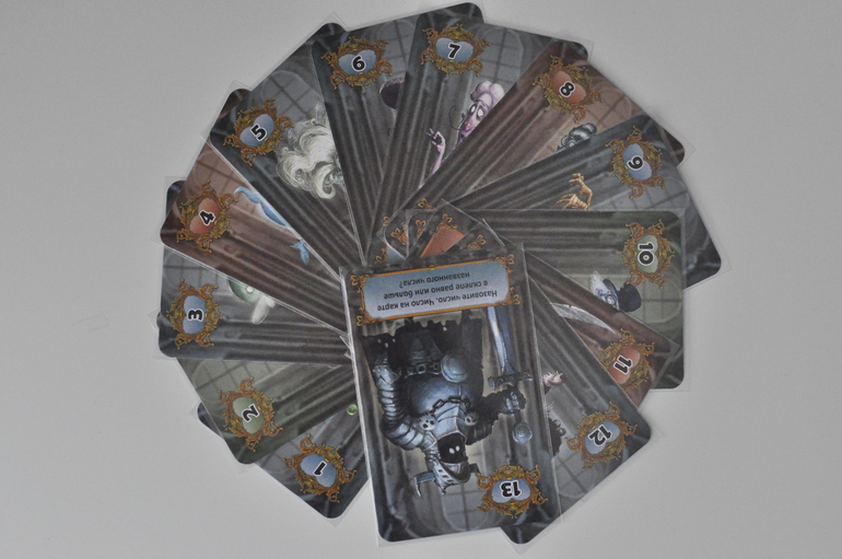 Противник отвечает нам, что его карта в склепе не равна 10-13 и играет шестёрку, мы тоже отрицательно отвечаем на его вопрос (наша карта не 8 и не больше). Сейчас он в более выигрышном положении: подобным вопросом он отмёл 6 карт, плюс его склеп, плюс сыгранная им же шестёрка.