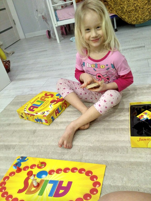 С Дашей играли в alias , пытается объяснять, больше 5 слов не успевает за минуту. Отгадывает хорошо. Нравится ей игра!!