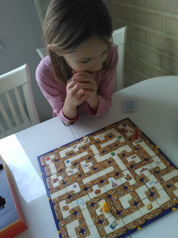 В четверг, это день когда мы с Аней бываем вдвоем после школы , мы играли в Сумасшедший Лабиринт. Играем в открытую, помогаем друг другу искать оптимальные ходы, нравится сам процесс. Аня стала прокладывать дорогу к атефакам в середине поля, раньше предпочитала по периметру выстраивать прямые. Интересно найти вариант хода за одно действие, иногда очень неожиданные решения получатся!!
