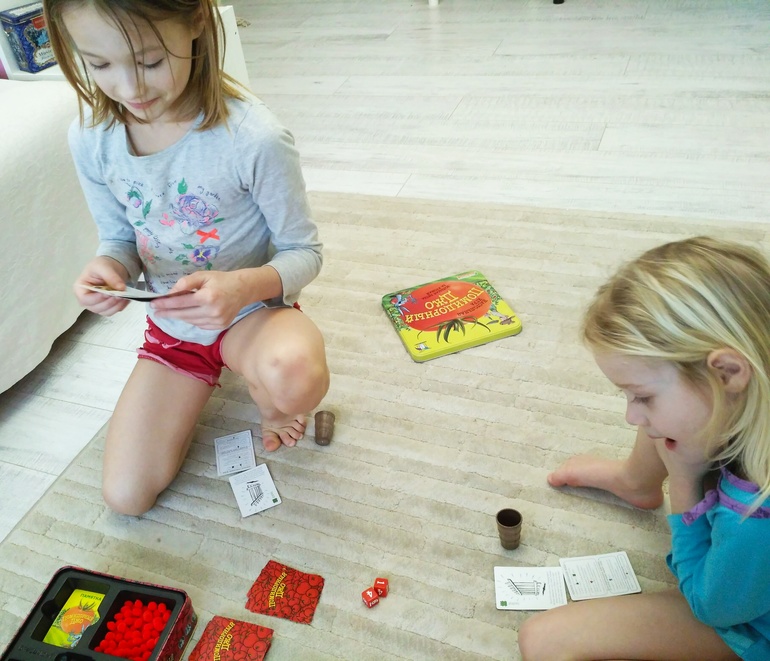 Помидорный Джо нравится обеим, сами несут корку, хотя Аня не любит конфликтные игры, а вот Даша наоборот всегда в играх идёт на открытое соперничество. Значение карт запомнили , Даша если забывает , спрашивает, суть и последовательность знает, хотя конечно ещё не полноценный игрок, но думаю скоро им станет.