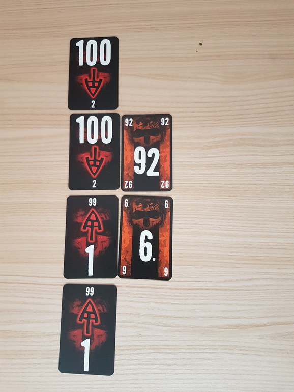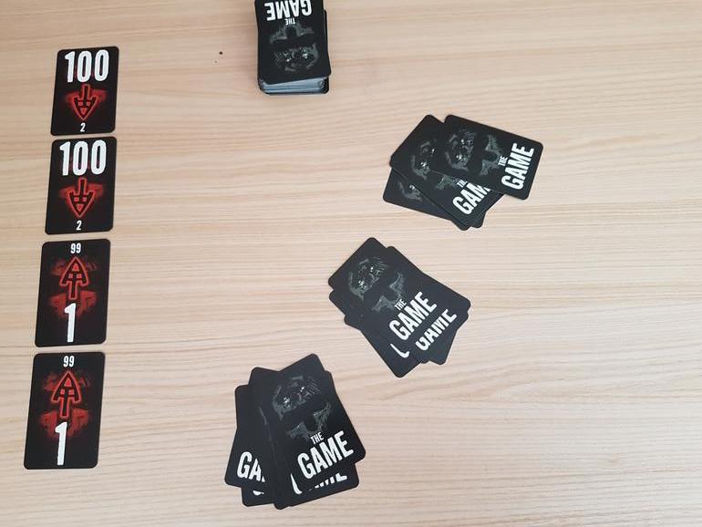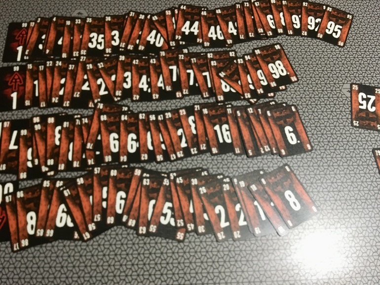 Игроки получают по 6 карт на руки (по 7 при игре вдвоем). Наша задача - выложить всю колоду карт в эти ряды. В два по убыванию и в два по возрастанию. Игра кооперативная, то есть задача для всех одна, и друг другу надо помогать. Смогли выложить - выиграли, нет - значит, проиграли. Сложность в том, что карты приходят в руку в случайном порядке, колода перемешана. Логично ряд от единицы продолжить двойкой и т.д., но двойка может прийти на руку игроку только в середине партии, а начинать надо с того, что есть. И хорошо еще, если значения имеющихся карт более-менее близки к стартовым.