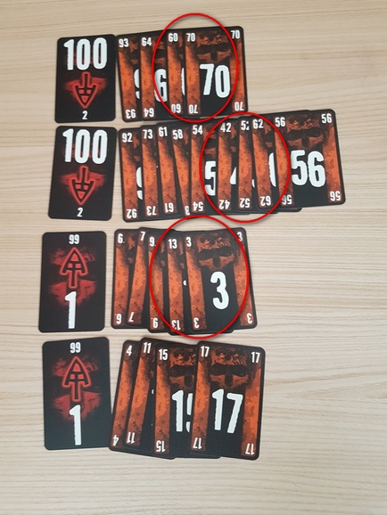 В свой ход нужно обязательно выложить минимум 2 карты с руки (максимум все 6). К тому же нельзя говорить партнерам по команде, какие карты у тебя на руке. Можно только намекать и сообщать, в какой ряд готов их положить. Даже если ты можешь идеально продолжить один из рядов, но сейчас не твой ход, ты вынужден ждать. Все, что можешь сделать - попросить других игроков не выкладывать карты в тот ряд, который тебе самому нужен. Но не факт, что они выполнят просьбу, потому что у них может просто не быть других вариантов хода. Бывает, к примеру, что после 93 кладем сразу 64, а у другого игрока (ход которого еще не подошел) остаются на руках 90 и 89.