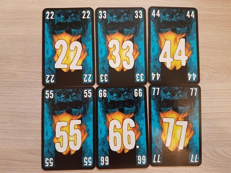 Для тех, кто уже натренировался, и выигрывает партию за партией, правила предусматривают более сложный режим - выкладывать в свой ход не по 2, а по 3 карты. Мы с дочкой ради интереса сыграли одну партию на двоих, выкладывая по 3 карты. В конце игры у нас осталось 15 карт на руках, немного не дотянули до победы, так играть намного сложнее. Еще вариант - можно на руках держать на одну карту меньше, чем в основных правилах. И добавляет огоньку небольшое дополнение, которое сразу вложено в коробку - "Игра с огнем". Это 6 карт синего цвета, которые заменяют соответствующие карты из основной колоды.