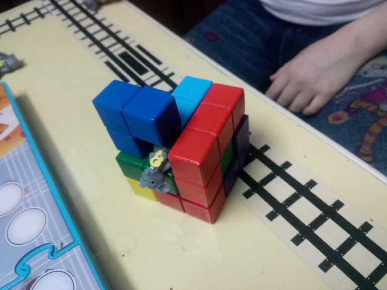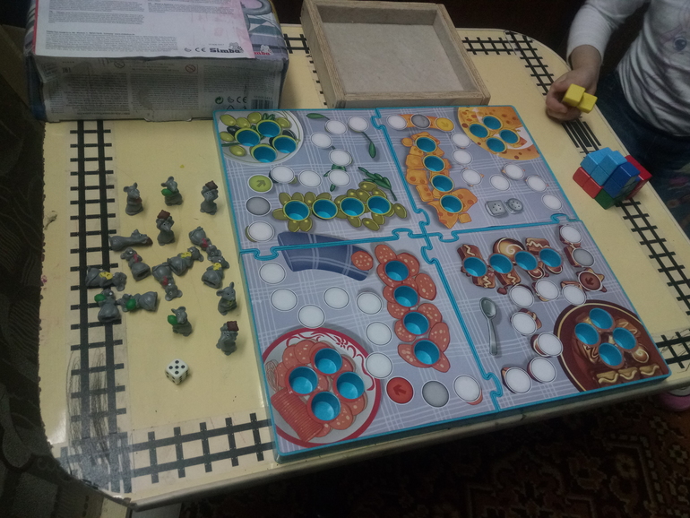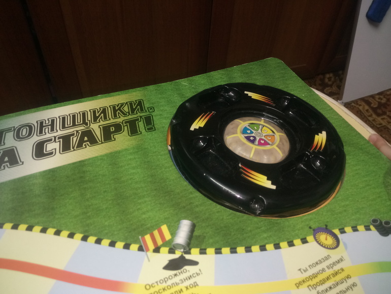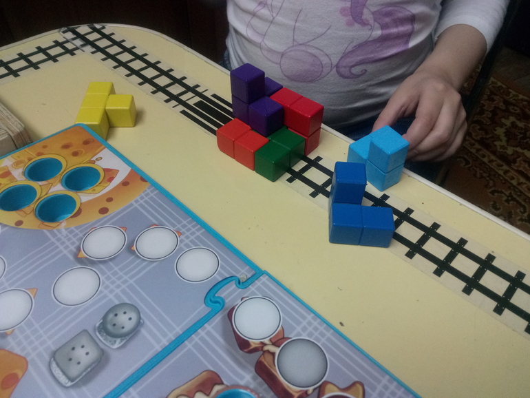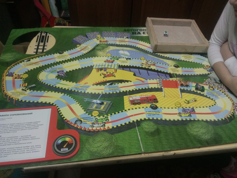 В нее она сыграла с удовольствием, но из-за особенностей ландшафта отстала от меня на половину поля. Пару раз попала на клетку с возвратом хода на 10 клеток назад. К игре прилагается устройство, которое должно заменять кубик, но оно к сожалению неработоспособно.