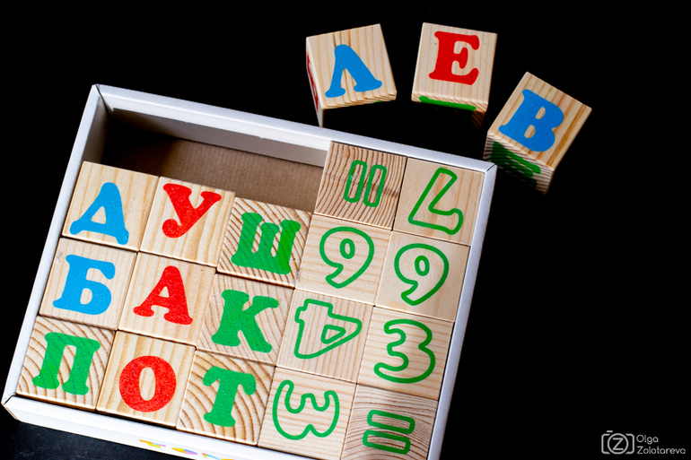 Ну и в обычные кубики с буквами иногда играем. У нас набор от Томик, я его покупала с целью переработать для авторской методики Чаплыгина. Но пока руки не доходят, собираем слова из того, что имеется.