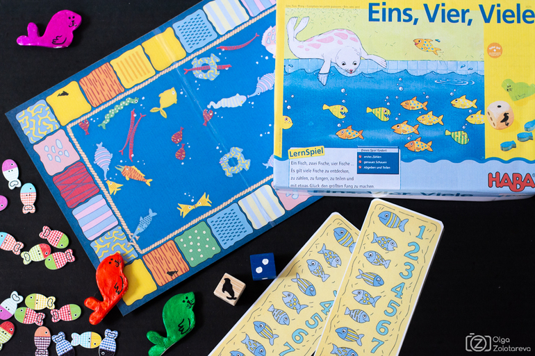 Один, Два Много от Haba. Поздновато я её сделала в том плане, что счет до десяти и дальше был у дочки давно отработан, пока я завершила игру (у дочки осенью-зимой возник повышенный интерес к цифрам и счёту, а игра была сделана лишь в её 3,9-3,10). Но несколько партий всё же было сыграно в охотку с интервалом в пару недель и даже месяцев. Бросаем кубик, двигаем по периметру поля тюленей, "ловим" в центре поля рыбу в количестве, соответствующем узору на квадратике, на которой стоит тюлень. Рыбу выкладываем на планшет, подсчитываем с его помощью. В игре несколько вариантов правил, с использованием спецкубика с картинками или без него.