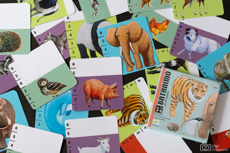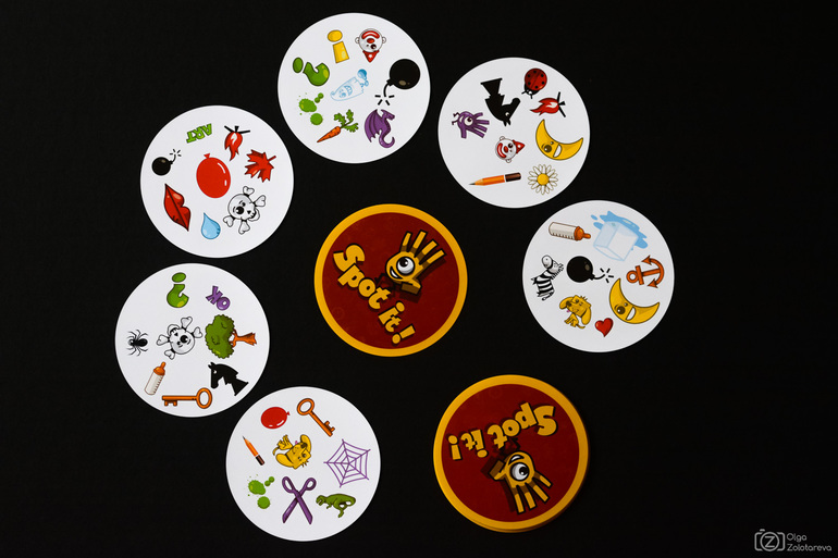 Доббль с нами также давно, гораздо раньше заявленного возраста начали играть. Всё не соберусь распечатать или купить другие версии игры с более детским артом, коих предостаточно. О конкурентной борьбе речь в возрасте 3-4 лет пока не идёт, но сам поиск одинаковых картинок дочку весьма увлекает.
