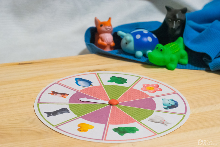 По прежнему (с 1,9 лет) играем то и дело в авторскую игру, которая представляет собой набор карточек с фотографиями животных, а также (не для каждого животного) - карточки с его тенью, его следами, фактурой кожи/шкуры, с частью тела.