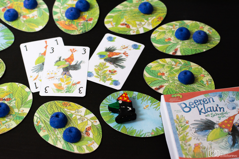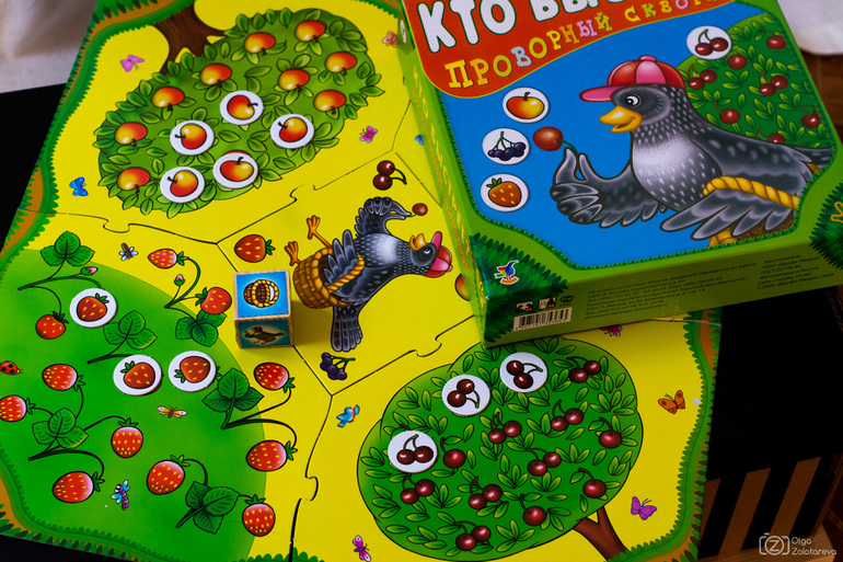 Ягодный воришка. Тоже ходилка и тоже для трехлеток. Ворон ходит по кругу, перепрыгивая с одного овального элемента на другой и собирая ягоды черники в лесу. Количество ходов определяет не кубик здесь, а карта. Есть карта кражи (справа в центре) - можно утащить ягодку у соперника. Участки леса, на которых больше нет ягод, переворачиваются обратной стороной и превращаются в болото. Если ворон приземляется на такое болото, его нужно спасать, жертвуя ягодку из своего запаса. Играем с 3,3 тоже, популярность игры была одно время очень высока, но как-то быстро сошла на нет. Но я часто встречала упоминание этой игры как одной из любимых на протяжении длительного периода.